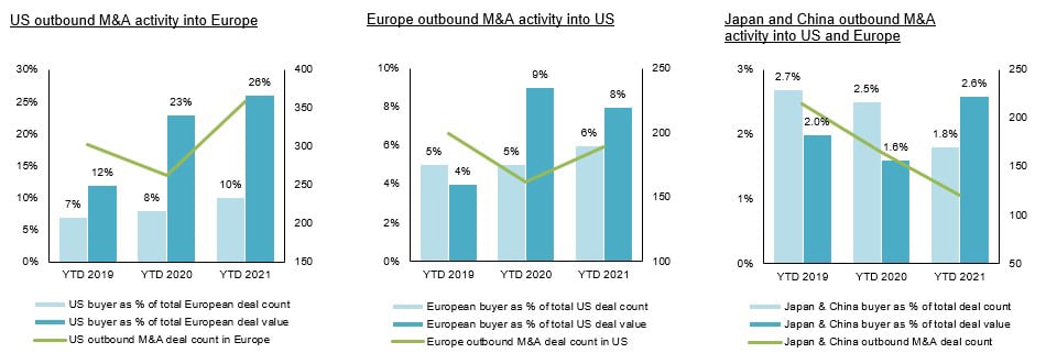 While outbound M&A from Japan and China into the US and Europe has not recovered to pre-Covid levels, we expect robust transatlantic M&A to continue in H2 2021. The vaccine rollout and reopening of economies in Europe will increase M&A appetite for European corporates to acquire in the US. However, they may have to leverage synergies to compete with the high valuations offered by US corporates and PE firms in their home market.