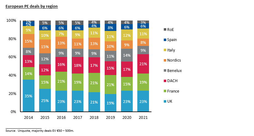 - UK, France and DACH accounted for a combined 64% of European PE deals, a new high watermark