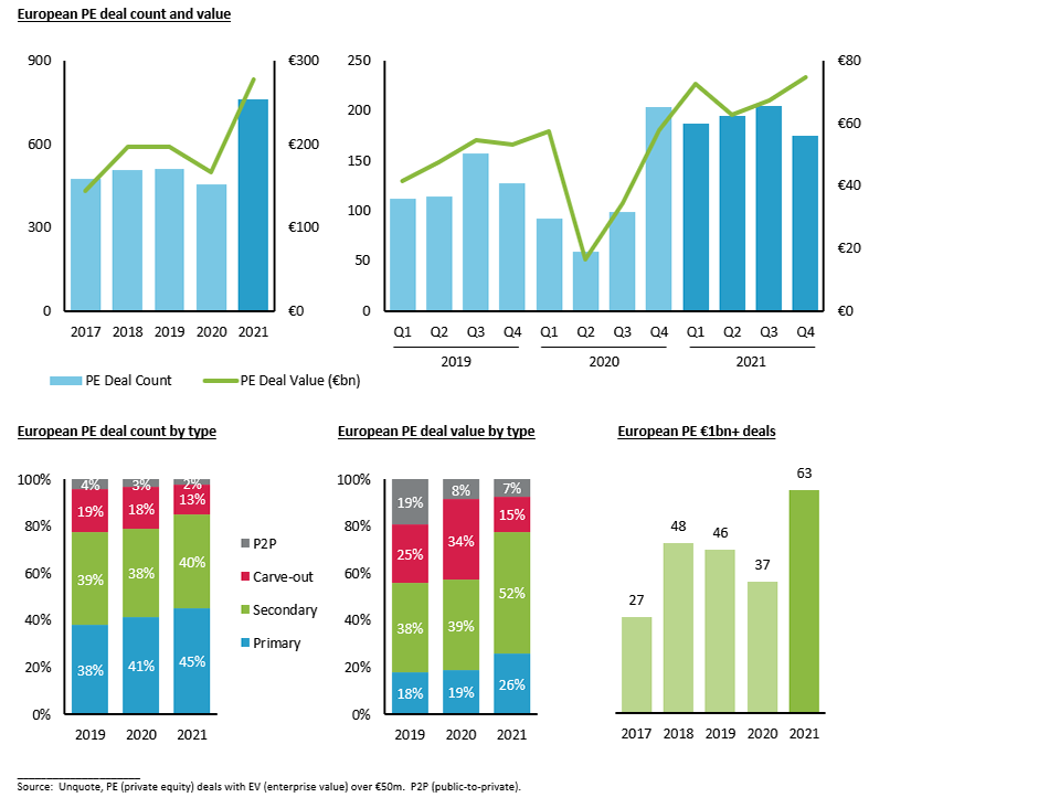 - Record European PE activity – 760 mid-market deals worth €277bn, including 63 €1bn+ deals in 2021