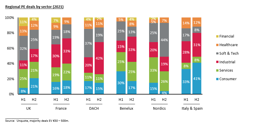 Sector mix by region shows the story of two halves in 2021, especially in DACH where software & technology was at a record 37% of deal count in H1 before quickly switching back to industrial as the most active sector in H2. We expect DACH PE activity in 2022 to be similar to H2 2021. Meanwhile in the Nordics, industrial activity is unlikely to be the most active sector in 2022 as the region’s software businesses are scaling up, attracting more private equity attention.