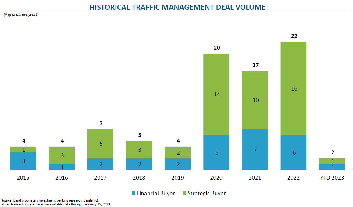 Federal stimulus dollars are just making their way through the system and are expected to fuel projects for the next several years. The $1.3T U.S. infrastructure bill was widely looked at to drive market activity. However, the deployment of those funds has been slow to be released (as of February 2023, $195B announced funding), but traffic management companies report they are just starting to see these dollars flow through the system and drive project activity. DoT projects have been in company backlogs for long periods of time (e.g., 12 months). Further, traffic management companies are seeing their backlogs grow as demand increases.