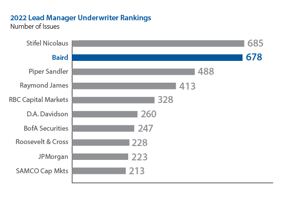 Baird is dedicated to meeting the long-term goals of our public, private and nonprofit municipal issuers through nationally ranked advisory, underwriting, placement agent and consulting services.